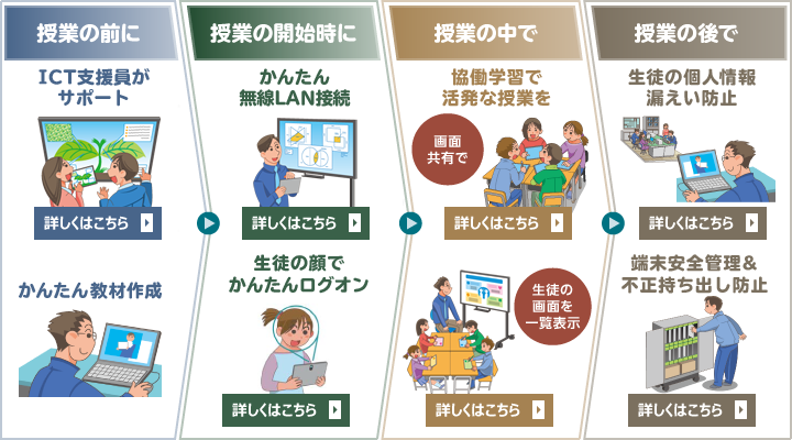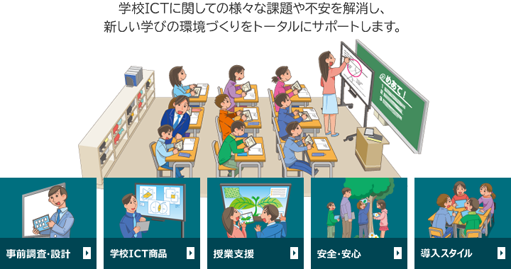 21世紀の学校教育に必要なICT機器の導入、運用管理からさまざまな支援サービスまでトータルに新しい学びの環境づくりをサポートいたします。