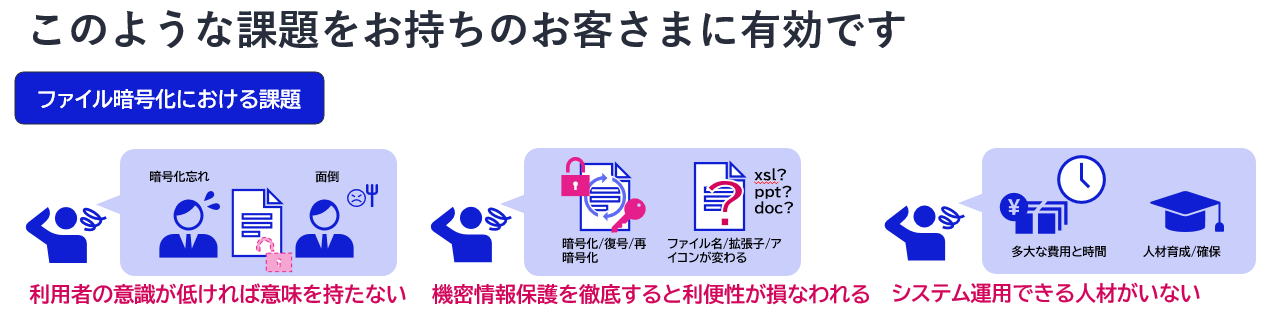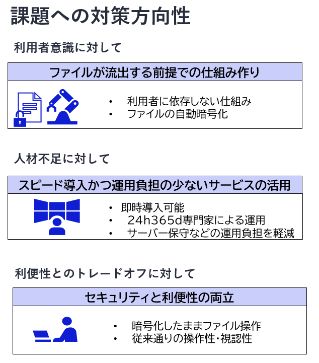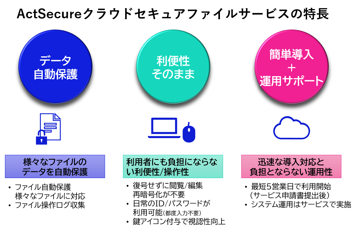 ActSecureクラウドセキュアファイルサービスは、ランサムウェアや標的型攻撃等のサイバー攻撃や人的ミス、内部犯行などにより万が一ファイルが外部に流出した場合でも、ファイル内の情報を漏えいさせない安心・安全なファイル暗号化の仕組みを提供するクラウドサービスです