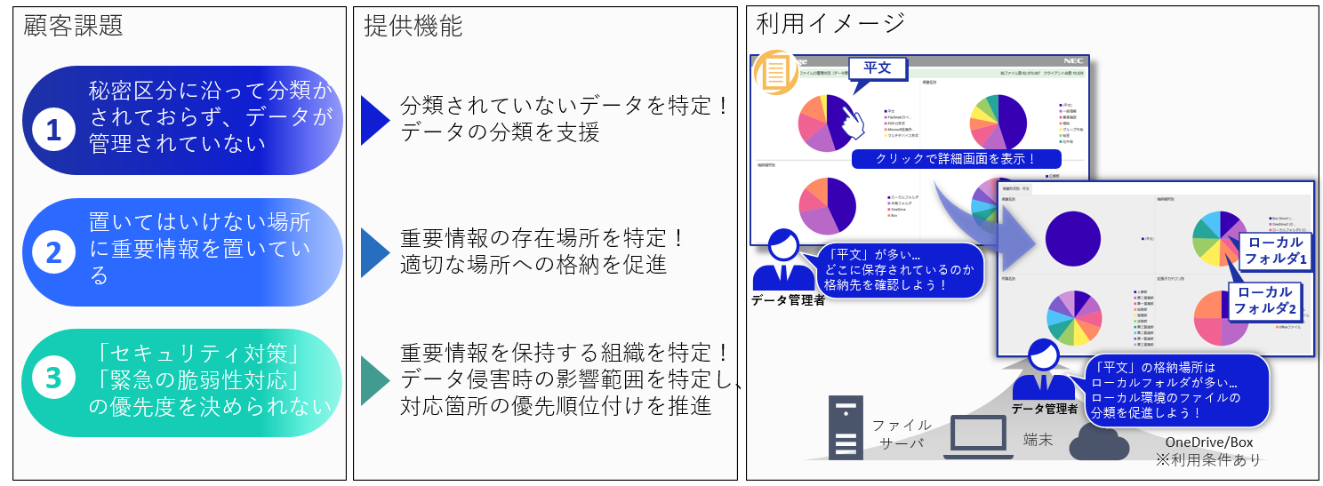 データ管理が複雑化するDX化において、重要情報が存在する場所や数を把握することで、データ漏えいリスクへの対処を支援します。