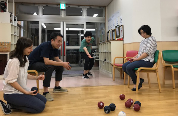 障がいのある方にスポーツを経験してもらう活動として、余暇活動の時間にボッチャを行いました。プレー経験のある職員から利用者さんへやり方を説明し、はじめはぎこちなくスタートしましたが、何度かやっていくうちに楽しさが伝わり、どんどん利用者さんの笑顔が広がっていきました。「もう一回やろう!」というリクエストが続き、3回戦の予定が7回戦に、そして次の週もボッチャのプレーが続くことになりました。今後は、なのはな会の地域サポートセンターでのボッチャ大会を企画しています。サポートセンターを利用する方たちとも、ボッチャを通して楽しい時間を過ごしていきたいと考えています。