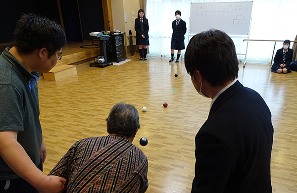 生徒が老人ホームに出向き、入居者のみなさんとボッチャをプレーする。本校ではそんな課題研究にトライしました。授業の一環であるこの活動は、生徒たちと老人ホーム入居者へボッチャを普及させると同時に、生徒に指導力や行動力を身に着けさせるねらいがあります。今回はヒューマンサービス科3年生の園芸福祉班の7名が参加しましたが、今後はクラス全体にボッチャの競技方法を覚えてもらいます。生徒は介護施設のほか、保育園や養護学校などにも行く機会があるので、この活動をさらに広げていきます。生徒を成長させ、ボッチャという競技を多くの方に伝え、学校としてオリンピック・パラリンピックを盛り上げていきたいと考えています。