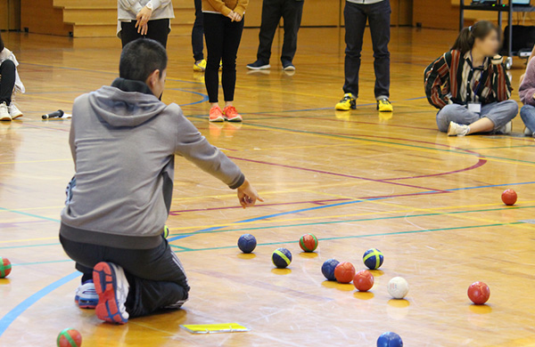 毎年4月に新入生を歓迎し、同級生・上級生・教員と交流する時間をもっており、その際にボッチャを体験しました。大学生活になじむこと、こども教育学科はどんな学科なのかを知ること、みんなの顔と名前を覚えて親睦を深めることを目的に、上級生リーダーたちが、ボッチャ大会をはじめとしたレクリエーションを企画しました。ボッチャのもつ魅力・パワーは、「やってみて楽しい」、「この楽しさをみんなに伝えたい」、「授業で使うにはどうしたらいいだろう…」と夢や可能性を広げてくれることだと思います。これは特別支援教育の模擬授業で、ボッチャを題材にした学生たちも同様に感じているようです。今後も講義などで教材として取り上げ、パラスポーツの日常化につながればと思います。