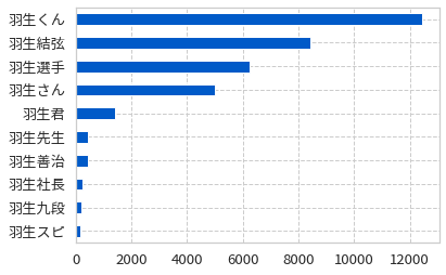 「図1 使用されている敬称上位10件」より、「羽生」には、「くん」「選手」「さん」「君」「先生」が敬称として使われているようです。個人の感覚では、「くん」「選手」「君」は羽生結弦選手に、「先生」「九段」は羽生善治九段に使用されていると考えます。(なお、「羽生社長」は、同一日に東京ヴェルディの社長が辞任しており、そのニュースに関するツイートでした。「羽生スピ」は同一日の羽生結弦選手のスピンが0点となったことに対するニュースのタイトルの一部でした。)