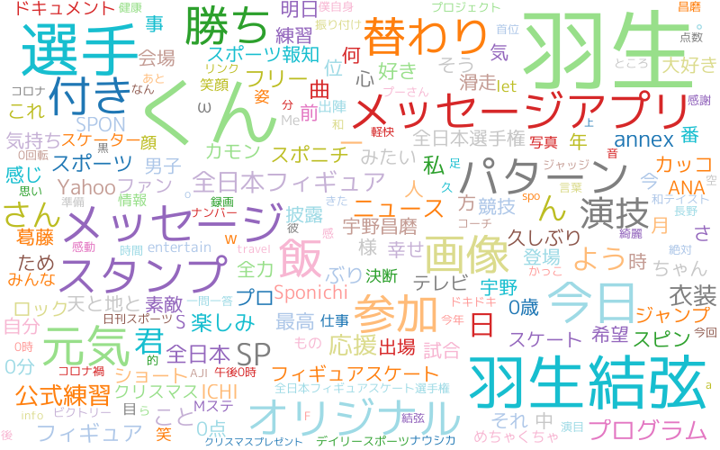 ワードクラウドでの頻出語を見ると、確かに敬称でお二方が区別されていることが分かります。例えば、「図2 『羽生結弦選手ツイート』のワードクラウド」では、「全日本フィギュア」や「宇野昌磨」「ジャンプ」など、フィギュアスケートに関係する言葉が頻出しています。なお、「メッセージアプリ」や「画像」という言葉が多くあるのは、味の素さんのツイート企画にて、羽生結弦選手のメッセージ入り画像が届く企画が行われており、その関連のツイートが多くあったためだと分かりました。
