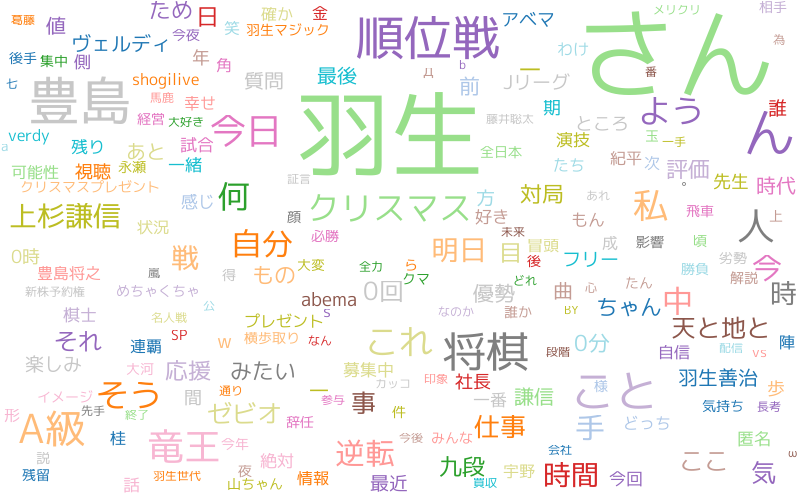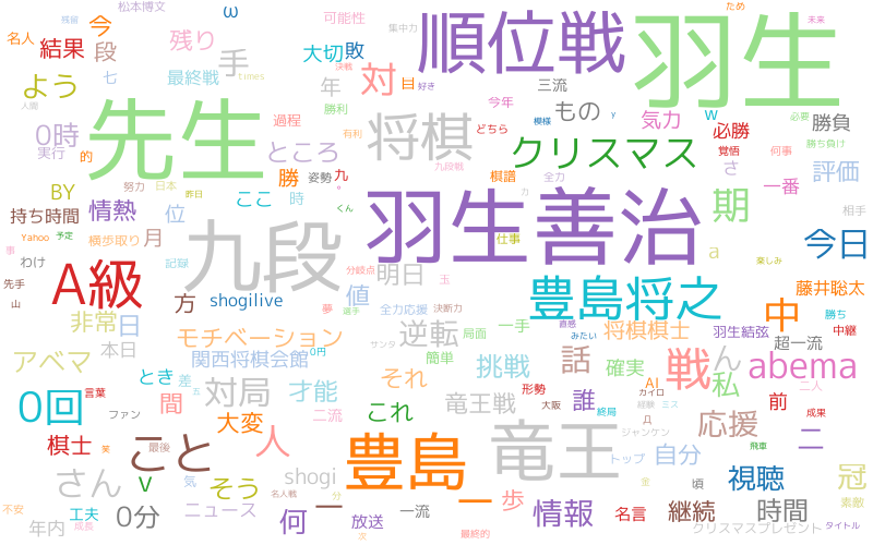 比較して、「図3 『羽生善治九段ツイート』のワードクラウド」では、「順位戦」や「豊島将之」のように将棋に関する単語が見受けられます。「クリスマス」が含まれているのは、羽生善治九段がクリスマスに豊島竜王と過ごすということがネタになっていたためですかね。