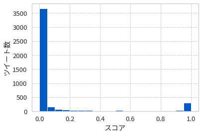 推測した結果のスコアのヒストグラムを「図5 スコアのヒストグラム」に示します。このスコアが1に近いほど「羽生善治九段ツイート」である確率が高く、0に近いほど「羽生結弦選手ツイート」である確率が高いということになります。そこで、スコアによりツイートを分割し、分割したツイートの頻出語をワードクラウドで表現することで、この推測が適切か否かを検証したいと思います。