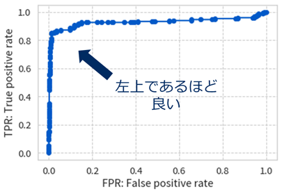 次に精度の評価を行います。簡易的に正解データを作成するため、将棋に関する語句(将棋、棋士、先手、後手、AI診断、A級、abema、順位戦、豊島、竜王)を含むツイート148件を「羽生善治九段ツイート」の正解データとしました。この時のROC曲線を「図8 ROC曲線」に示します。ROC曲線とは、縦軸に真陽性率(True positive rate。正しく1と判定した割合)、横軸に偽陽性率(False positive rate。誤って1と判定した割合)を、真偽を判定する閾値毎にプロットしたものであり、左上であるほど良い精度と言えます。この時のAUC(曲線より下の面積。最大が1であり数値が大きいほど精度が高い)は0.928であり、今回構築したモデルは、精度が高いモデルであると言えます。実際にスコア上位のツイートを見てみると、順位戦の中継を見ているツイートが多く含まれておりました。中には「自分は将棋では羽生さんに勝てる」という意味のツイートや、佐藤天彦九段との名人戦を思い出しているツイート等、順位戦には直接関係のないツイートであっても「羽生善治九段ツイート」と判定しており、機械でも「羽生さん」の区別ができていると考えられます。