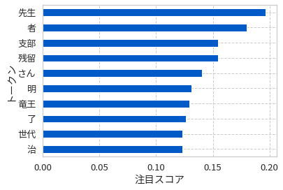 最後に、BERTの判定にどの語句が使用されているのかを可視化してみます。「図9 「羽生善治九段ツイート」推測でBERTが着目したトークン上位10件」では、BERTが推測で各トークン(語句)に着目した度合いを示したものです。「竜王」や「治」(「羽生善治九段」の一部と思われます)等、直接将棋を示しているものや、「残留」という順位戦に関する語句に着目するなど、人間と同じような語句に着目して「羽生さん」を区別していることが分かります。