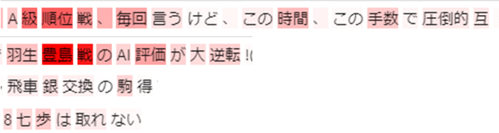 また、「図10 各ツイートの注目スコア可視化結果(一部抜粋)」では、各ツイートに対して、着目スコアが高い語句ほど濃い赤で示した可視化結果を示します。「順位戦」や「豊島」などはもちろんですが、「手数」や「飛車」「8七歩」など将棋に関する語句に着目していることが分かります。