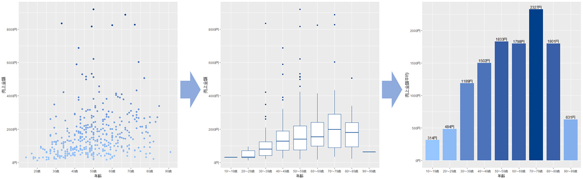 ただし、ここまで説明してきた1~3を並べてみると明らかですが、散布図→箱ひげ図→棒グラフの順に情報としての粒度が下がっていくのが分かります(個別値→代表値)。