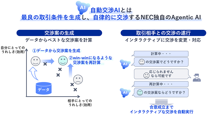 調達交渉AIエージェントは、NEC独自のAgentic AIである自動交渉AIを活用し、最良の取引条件を生成・自律的に交渉を行うAIエージェントです