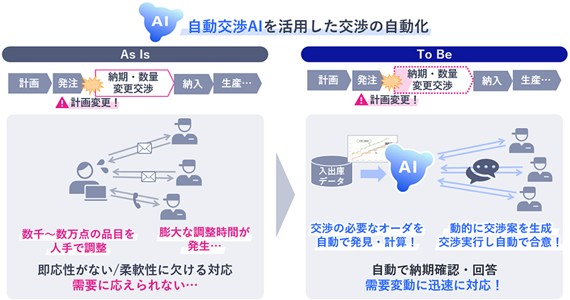 製造業の調達業務における納期・数量調整交渉を調達交渉AIエージェントによって自動化するサービスを提供します。取引先との日常的な交渉に費やす膨大な時間を削減し、需要変動への迅速な対応を実現します。