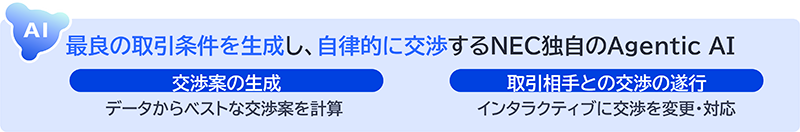 NEC 自動交渉ソリューション for SCMは、自動交渉AIを活用してサプライチェーン領域における様々な交渉プロセスを自動化し、業務の効率化/迅速化を実現します。