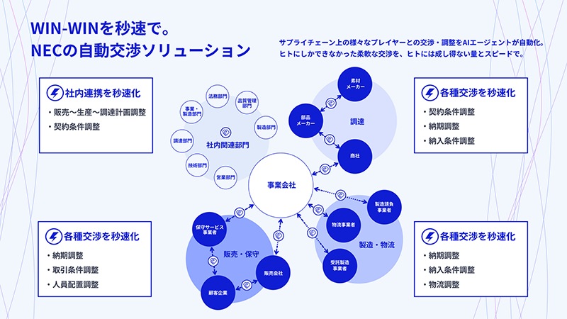 昨今の経済拡大やグローバル化により、製造業におけるステークホルダー間の交渉は複雑化し、企業に大きな負担を与えています。NEC 調達交渉AIエージェントサービスは、取引先との交渉業務にかかる膨大な時間を削減し、交渉の効率化・需給変動への迅速な対応を実現します。