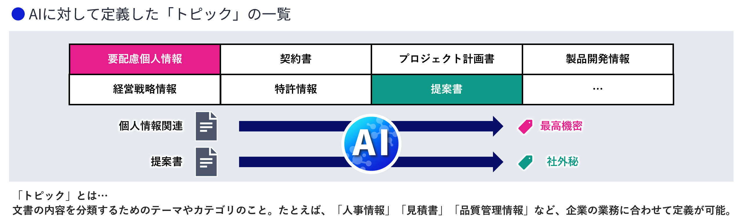 NECの独自AIに定義した「トピック」に基づき文書を解析、適切な秘密度ラベルを自動で判別します。