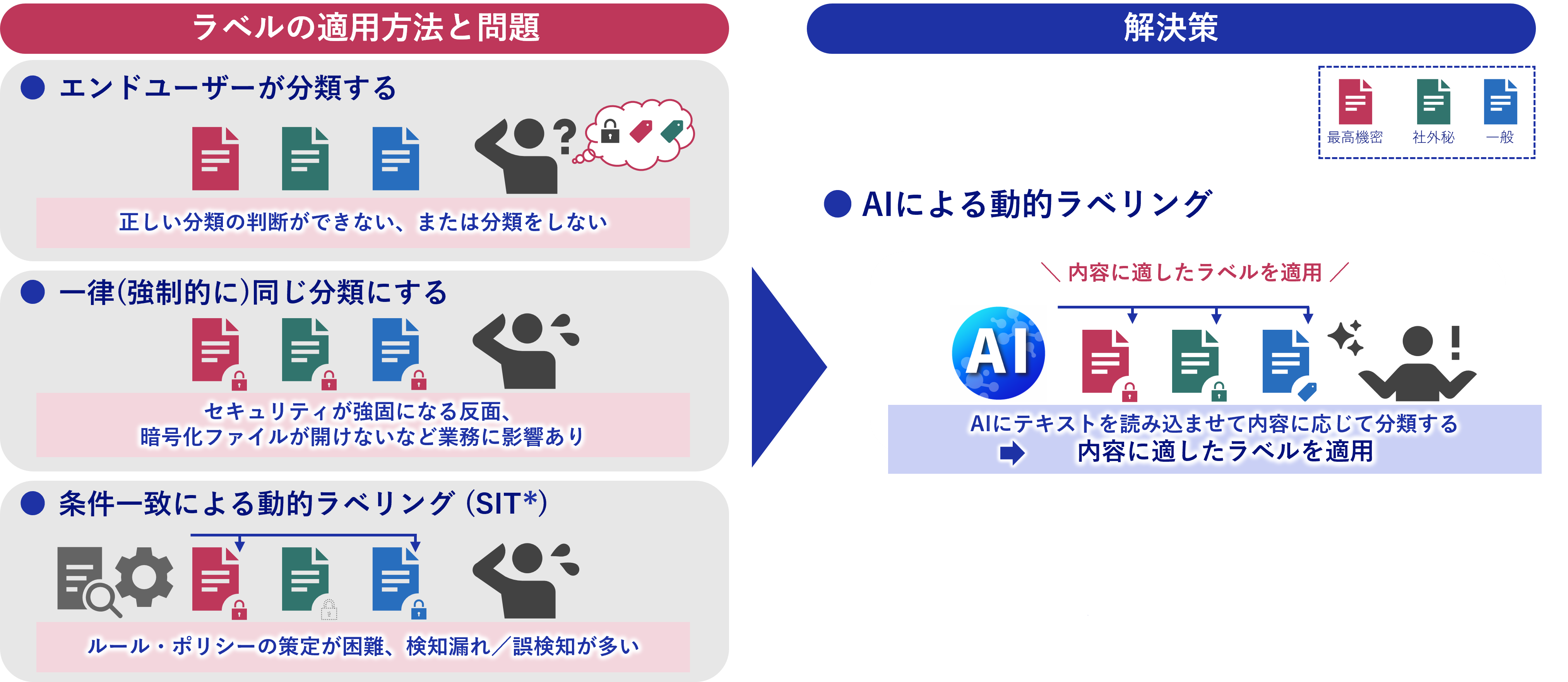 キーワードや条件一致による動的セキュリティラベリングのルール策定が難しく、検知漏れや誤検知が発生しやすい。
