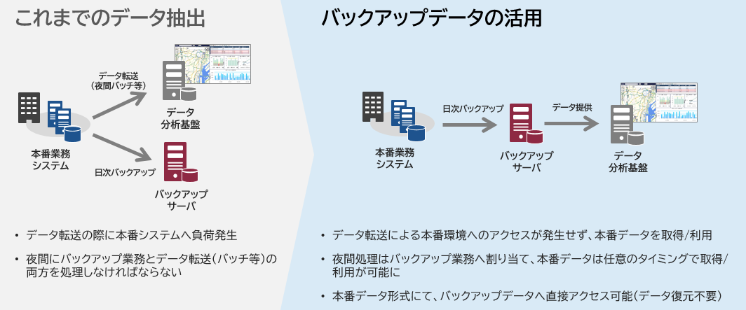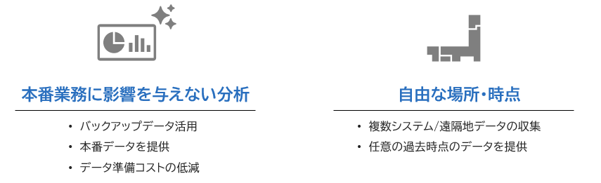 本番環境のデータに直接アクセスするのではなく、バックアップデータにアクセスすることで、本番業務に影響させずに、データ分析が行えます。