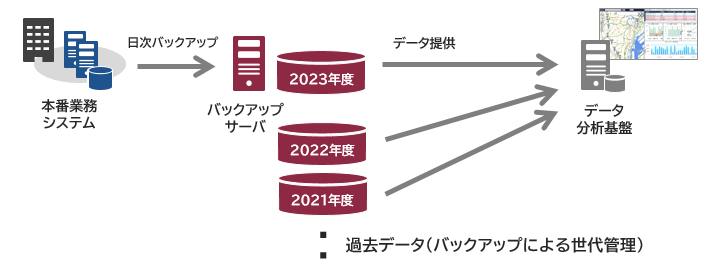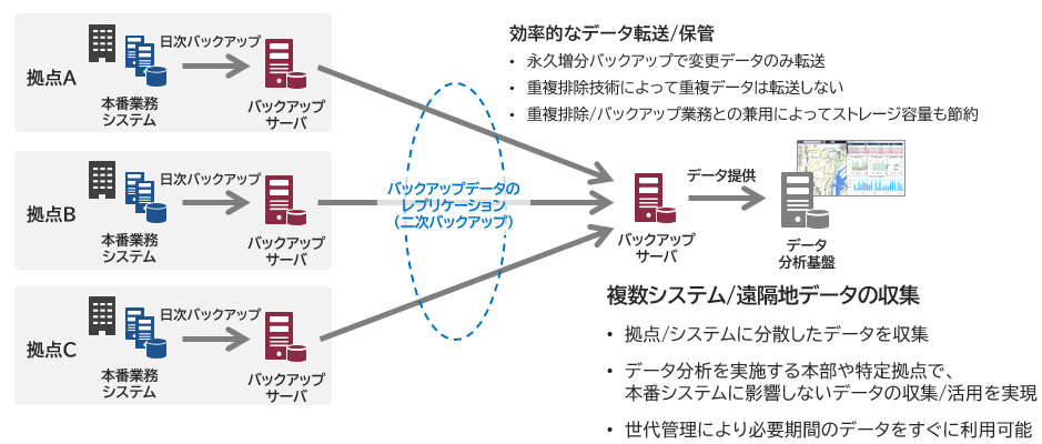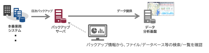 バックアップデータをデータ分析に利用することで、複数システム/遠隔地拠点からの本番データを自動的に転送・収集できるようになります。また、過去のデータが必要な場合も本番システムにアクセスは不要で、世代管理されているバックアップデータから必要な期間のデータを分析基盤へ提供することができます。