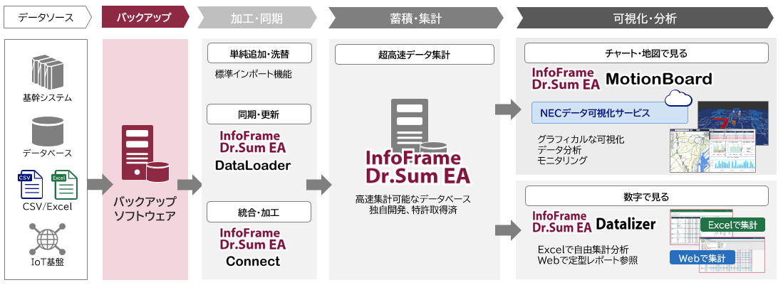 本番環境のデータは、バックアップソフトによって取得し、データの可視化・分析を行う製品(Dr.Sum製品等)へ、データを提供します。データを加工・統合するような製品へ提供することも可能です。