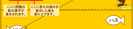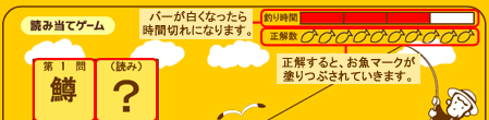 制限時間内に正しい漢字の読みを見つけだし、釣り上げるゲームです。