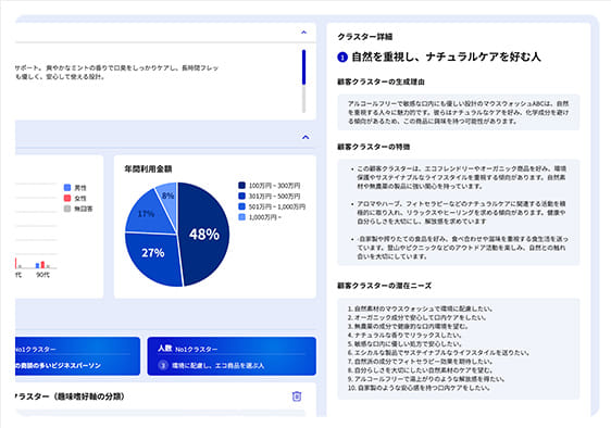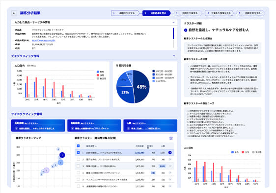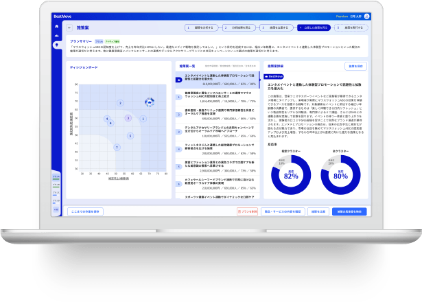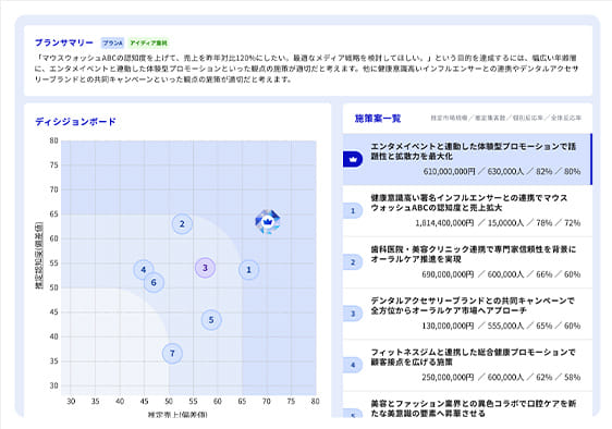 施策立案ビッグデータから得られる高精度なターゲット分析と成果予測から導き出される最適な施策によって自信をもった意思決定を可能にします。