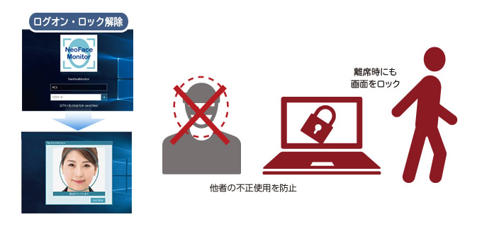 - *1:利用者の顔を一定間隔で顔認証し、利用者の離席時や未登録ユーザ着席時は認証NGとなり、自動的に画面をロックする機能。