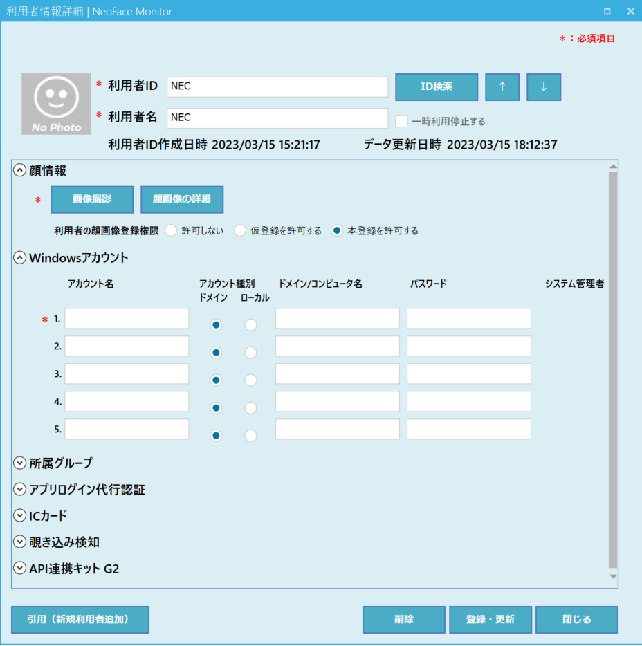 パッケージ版の新バージョン「NeoFace Monitor V7」では、利用者情報の管理において従来、項目毎に分離していた情報入力画面を統合するとともに、利用者情報全体の一覧表示や個別の設定情報を一元的に登録・更新できるようにするなど操作性を改善しました。