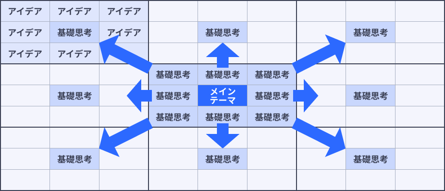 8つのマスを埋めたら後、新たに3×3のマスを8個用意し、それぞれの中央のマスに先ほど埋めた8つのアイデアを記載します。そして8個それぞれに関連するアイデアを周囲のマス目に書き出します。結果的に8×8=64個ものアイデア創出が可能です。