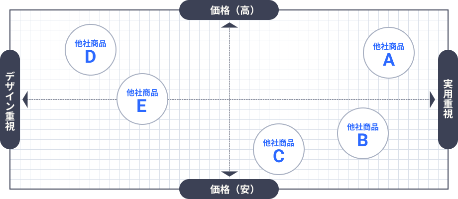 自社と競合商品をマップとして可視化することで、市場における競争関係を相対的に把握できます。主に顧客視点による分類を縦軸と横軸でマッピングします。