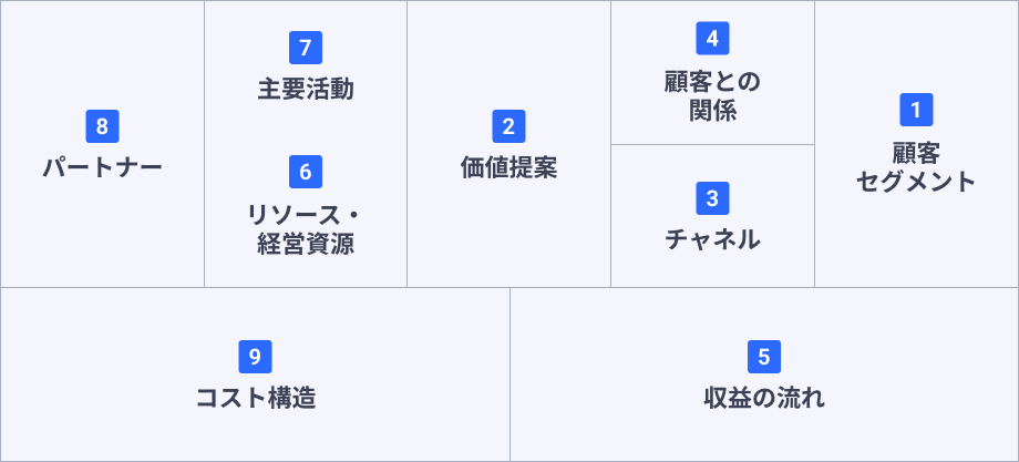 9つの要素:顧客セグメント、価値提案、チャネル、顧客との関係、収益の流れ、リソース・経営資源、主要活動、パートナー、コスト構造