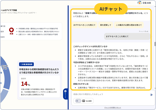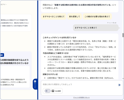一般的なチャットボットとの最大の違いは、診断機能との連携です。 企画書の内容や診断スコアをAIが把握しているため、前提条件を一から説明する必要はありません。「さっきの指摘、どういう意味?」と聞くだけで、文脈を踏まえた回答が返ってきます。