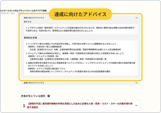 「次は何を検証すべき?」「インタビューは誰に聞けばいい?」など、事業開発プロセスにおける漠然とした悩みもご相談ください。 AIが壁打ち相手となり、次に行うべき具体的なアクションや調査方法の整理をお手伝いします。