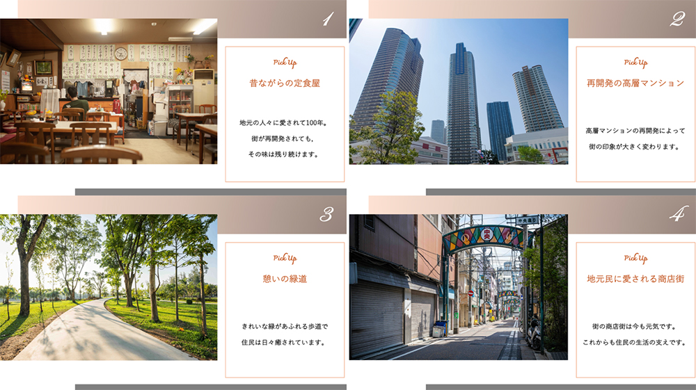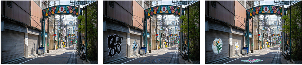 被験者を無作為に、グループ1:通常、グループ2:落書き、グループ3:アートに分け、図1に示す都市の情報を提示しました。その中に、興味の対象である商店街のシャッターの写真が含まれており、図2に示すとおり、各グループに対応する写真を挿入しました。つまり、被験者は、シャッターの評価とは認識することがないため、バイアスを与えずに、シャッターの効果だけを抽出することができます。