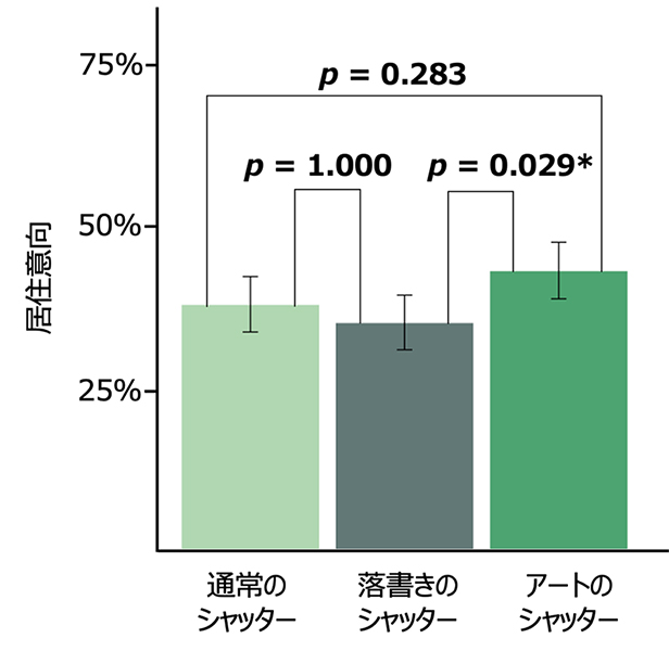 居住意向を示した割合は、通常: 38.2%、 落書き: 35.4%、アート: 43.4%となり、落書きとアートで有意差が検出されました。通常と比較しても、アートの方が高いスコアを獲得しましたが、有意差は検出されませんでした。しかし、これはアートの種類や完成度によって、さらなる高い効果を得られると期待されます。