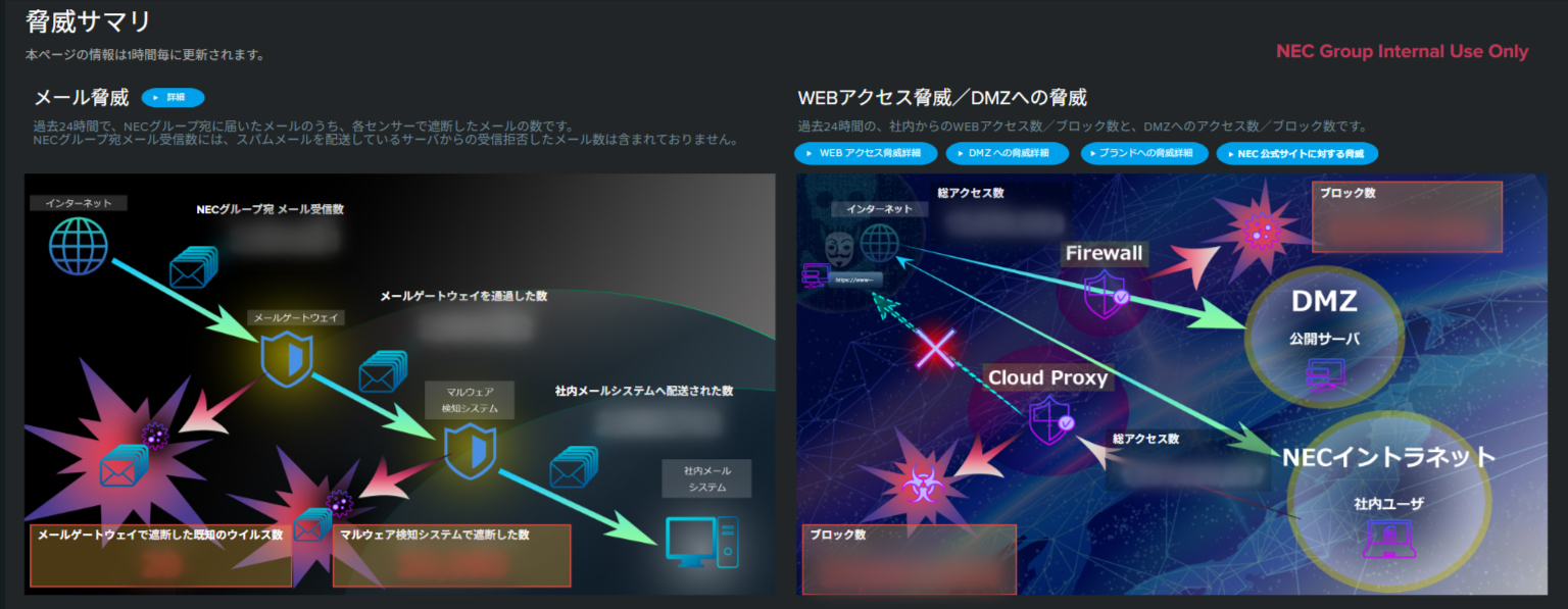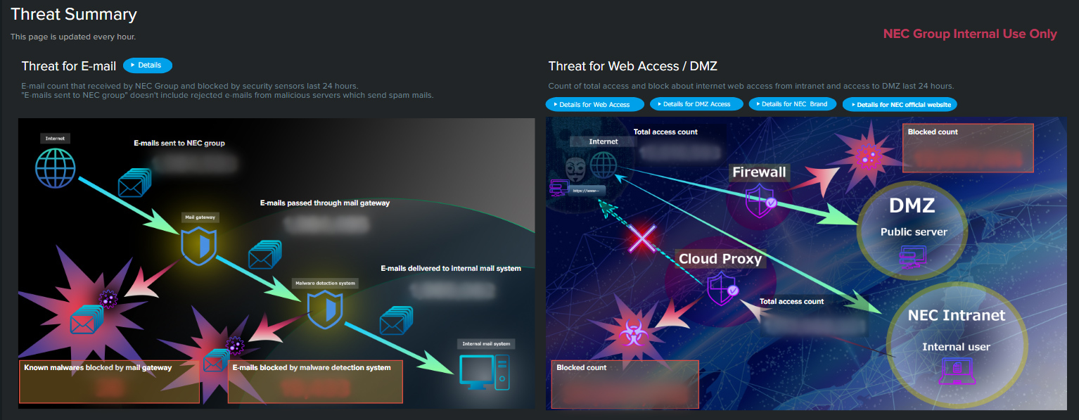 This dashboard visualizes cyber attacks against the NEC Group in real time. By graphically displaying attack volumes, types, and defense status based on actual data, we effectively raise risk awareness among all employees while demonstrating the impact of security investments to leadership.