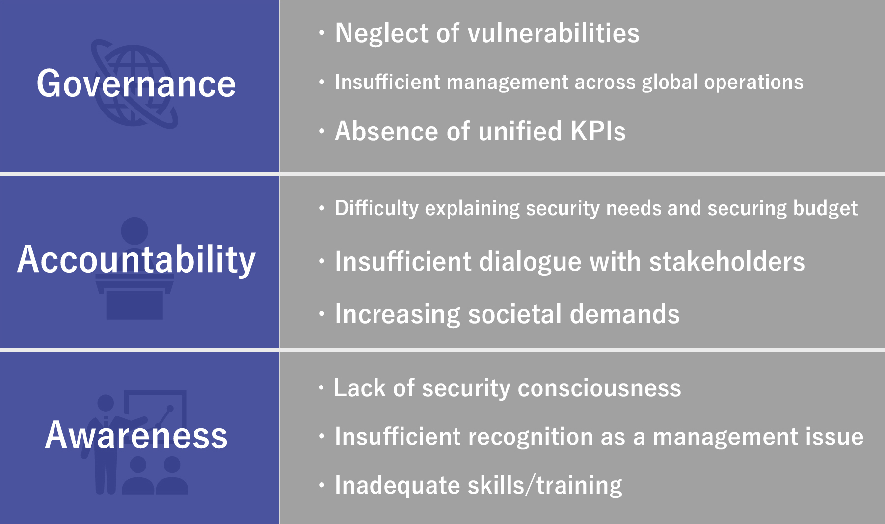 Organizations face numerous practical challenges in addressing these vulnerabilities. Based on our analysis, NEC has organized the issues to be resolved into the following three managerial perspectives.