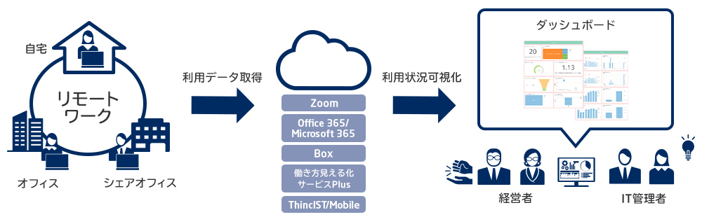 | 4 | 働き方見える化サービスPlus(*)利用状況 | 働き方見える化サービスPlusの利用者の稼働時間や利用アプリ状況等を可視化して表示します。 |