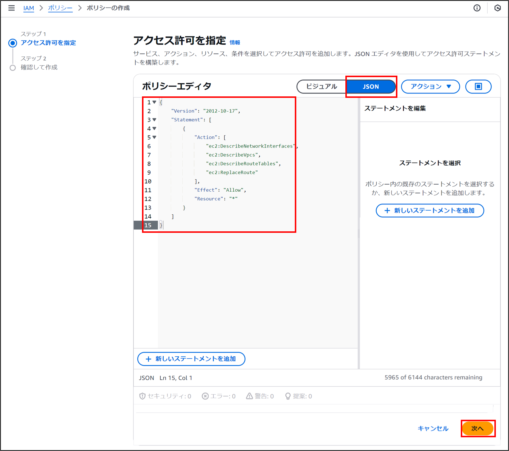 まずIAMロールにアタッチするIAMポリシーを作成します。AWSマネジメントコンソールから、IAMサービスを開きます。左のメニューから[アクセス管理]→[ポリシー]を開き、メニュー右上の[ポリシーの作成]をクリックします。タイプとして[JSON]を選択し、ポリシーエディタに以下を入力します。