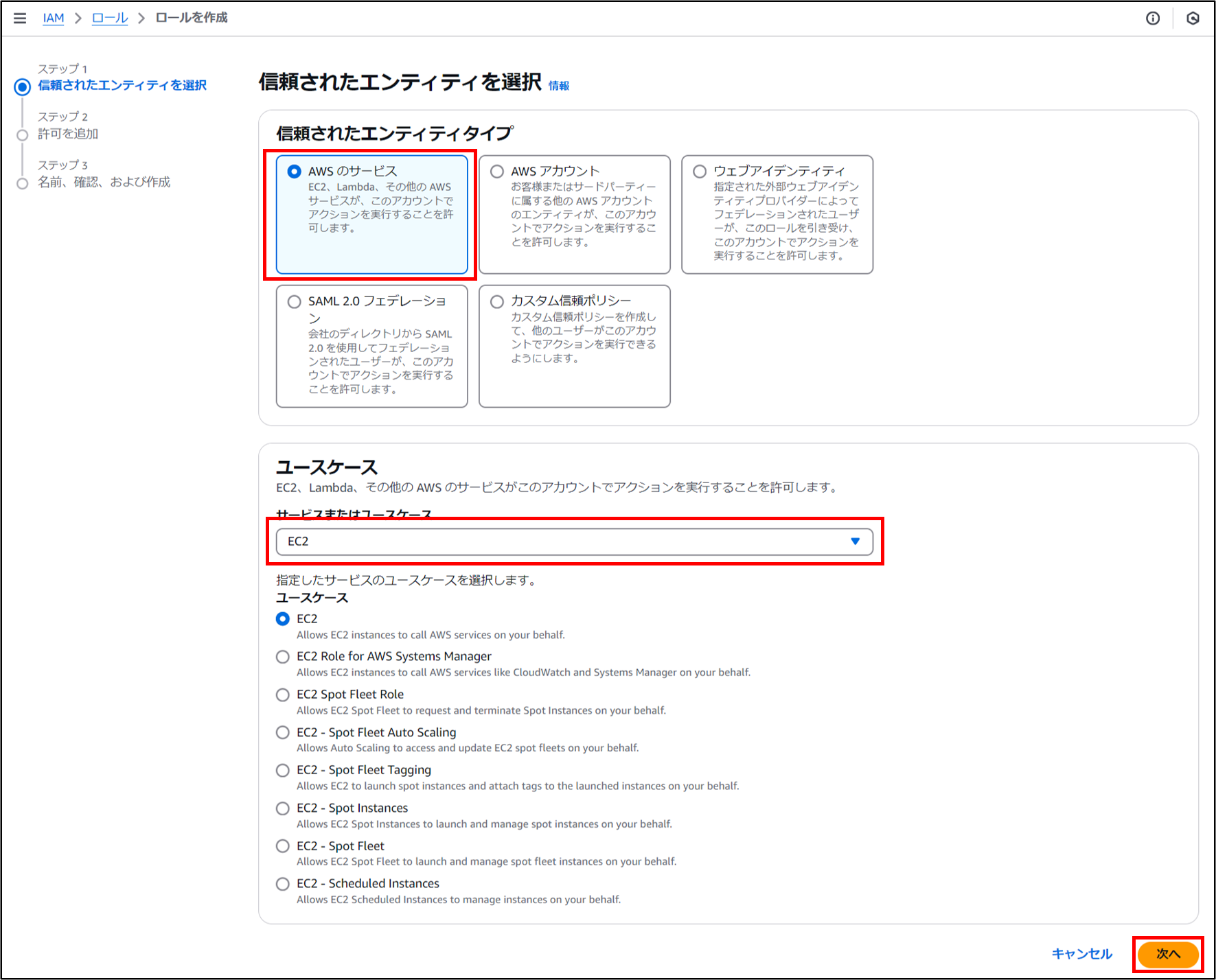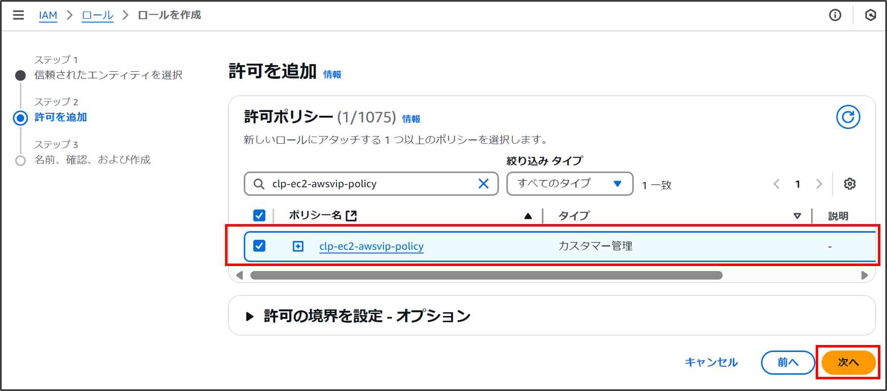 [許可ポリシー]では、先ほど作成したIAMポリシーにチェックを入れ、[次へ]をクリックします。