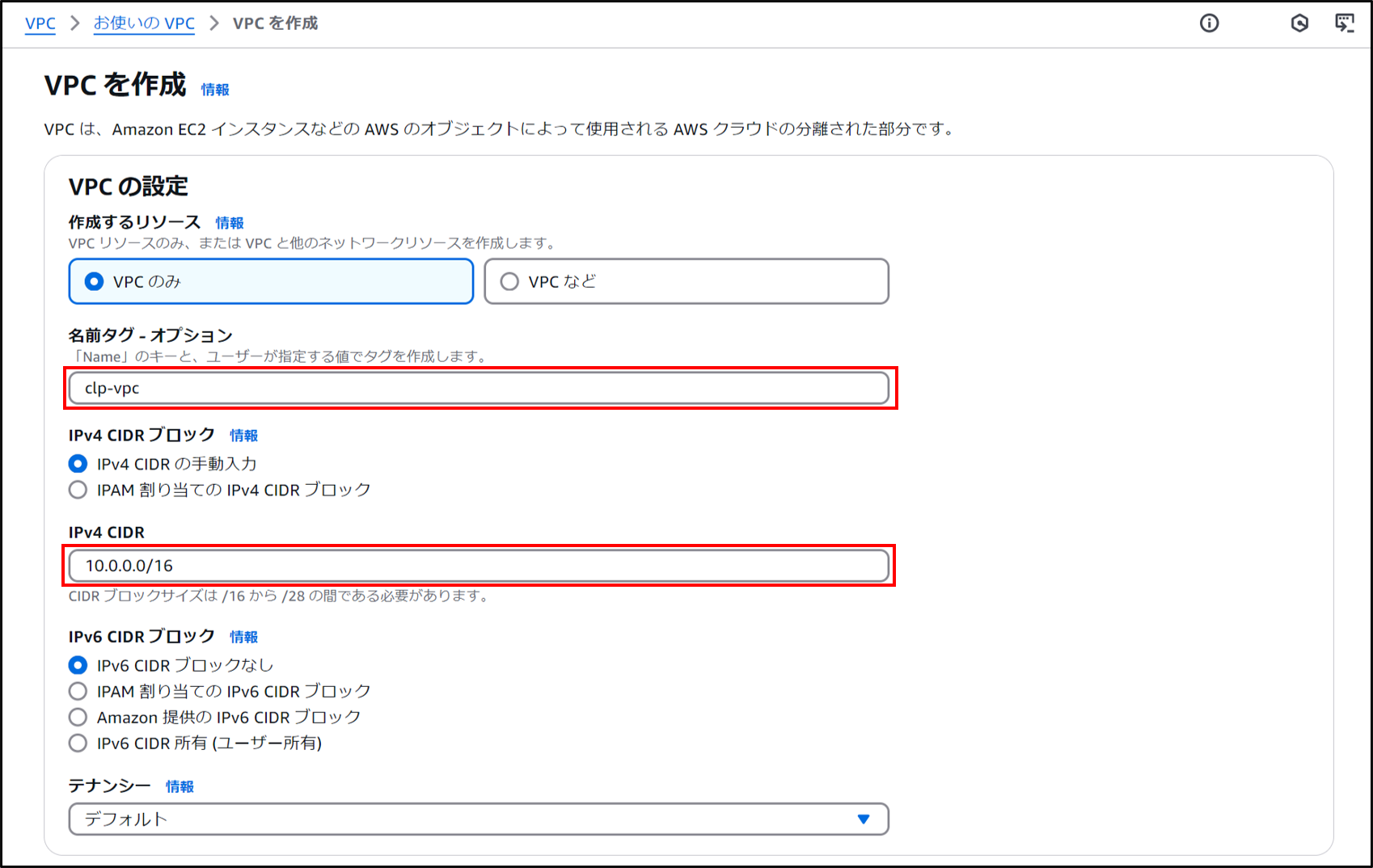 AWSマネジメントコンソールから、VPCサービスを開きます。左のメニューから[仮想プライベートクラウド]→[お使いのVPC]を選択し、画面右上の[VPCを作成]をクリックします。[名前タグ]に「clp-vpc」と入力します、[IPv4 CIDR]にVPCのCIDRブロック(10.0.0.0/16)を入力します。設定が完了したら[VPCの作成]をクリックします。