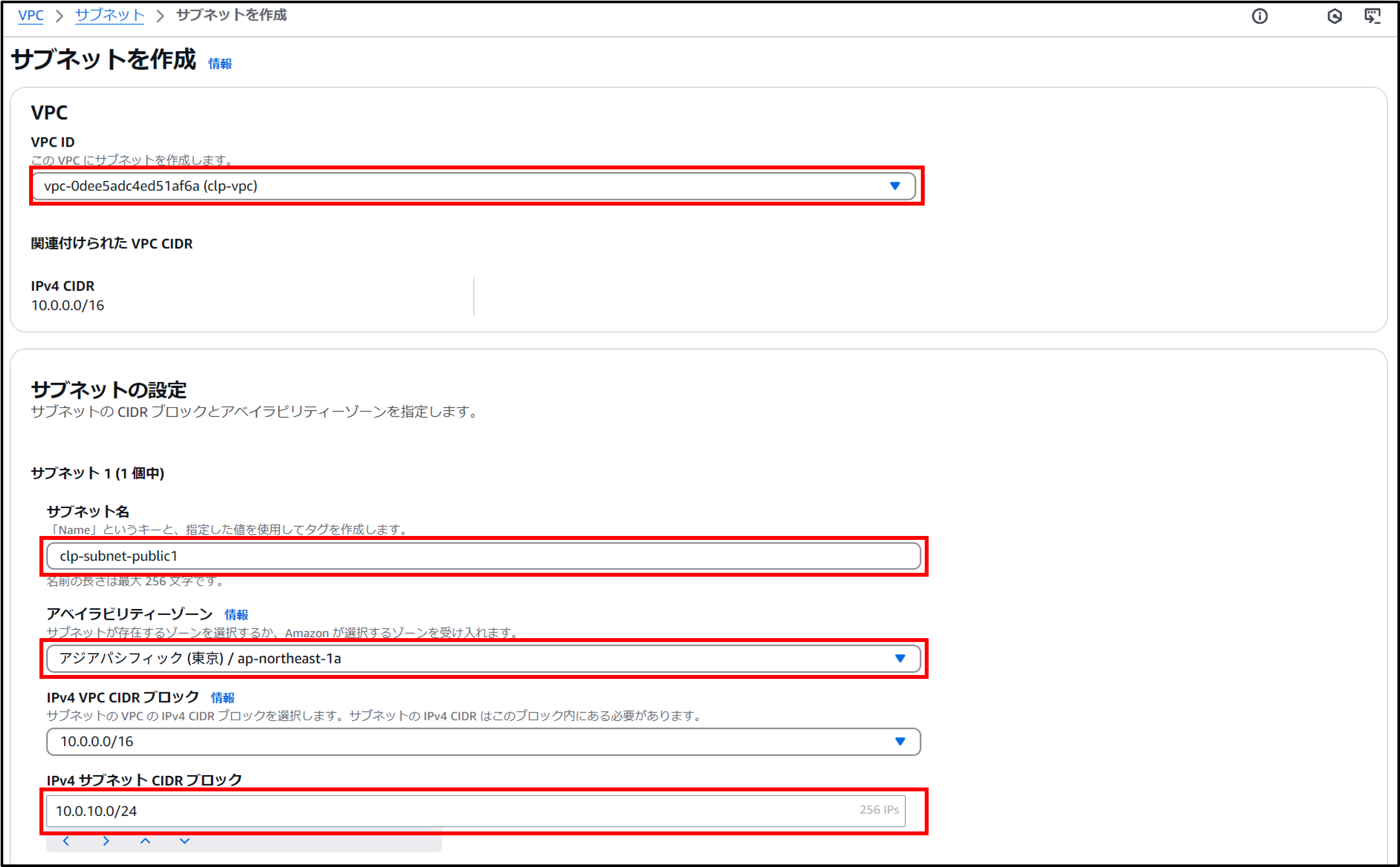 まずはAZ-Aに配置するパブリックサブネット(Public Subnet 1)を作成します。[VPC ID]で「clp-vpcのID」を選択します。[サブネット名]に「clp-subnet-public1」と入力します。[アベイラビリティーゾーン]でap-northeast-1aを選択し、[IPv4サブネットCIDRブロック]にPublic Subnet 1のCIDRブロック(10.0.10.0/24)を入力します。