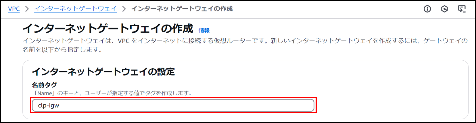 AWSマネジメントコンソールから、VPCサービスを開きます。左のメニューから[仮想プライベートクラウド]→[インターネットゲートウェイ]を選択し、画面右上の[インターネットゲートウェイの作成]をクリックします。[名前タグ]に「clp-igw」と入力し、[インターネットゲートウェイの作成]をクリックします。
