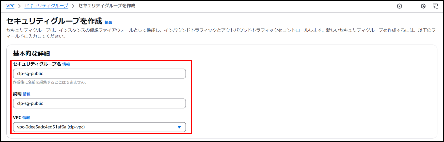 [セキュリティグループ名]と[説明]に「clp-sg-public」と入力し、[VPC]を選択します。設定が完了したら[セキュリティグループを作成]をクリックします。