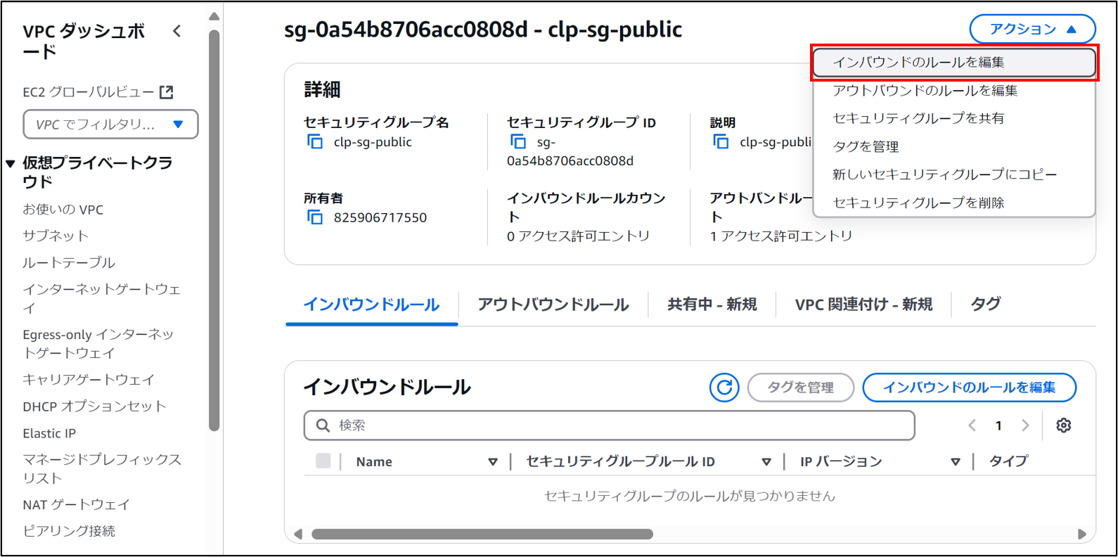 セキュリティグループの一覧から「clp-sg-public」を選択し、セキュリティグループIDをクリックしてセキュリティグループの情報を表示します。[アクション]→[インバウンドのルールを編集]を選択します。