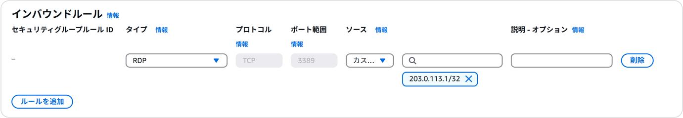 - ※画像はIPアドレス203.0.113.1の環境から接続する設定の例です。ソースに不必要に広い範囲のCIDRブロックを指定した場合、インターネットから不正なリモートデスクトップ接続を試行される恐れがありますので、ご利用中の環境に合わせた適切な設定が必要です。