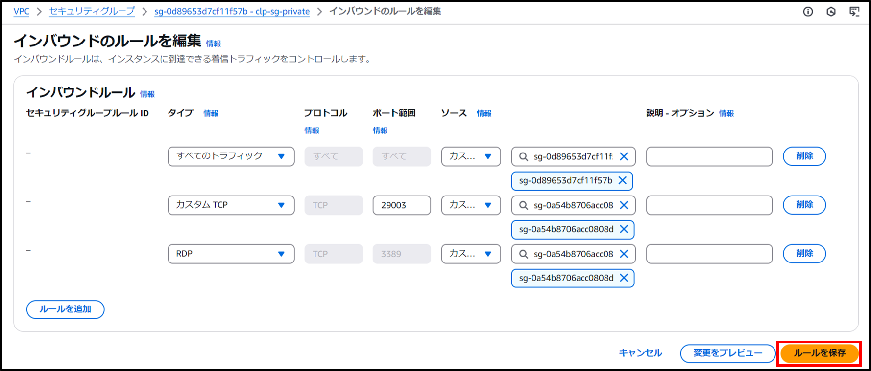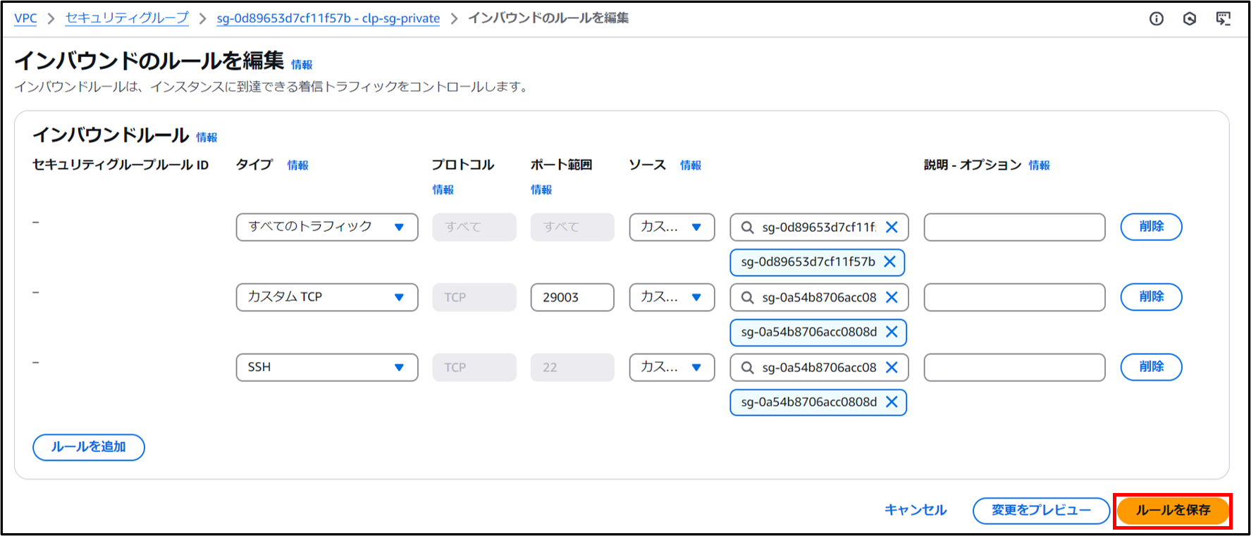 [セキュリティグループ名]と[説明]に「clp-sg-private」と入力し、[VPC]は「clp-vpc」を選択します。設定が完了したら[セキュリティグループを作成]をクリックします。セキュリティグループの一覧から「clp-sg-private」を選択し、セキュリティグループIDをクリックしてセキュリティグループの情報を表示します。[アクション]→[インバウンドのルールを編集]を選択します。プライベートサブネット内での通信と、パブリックサブネットからのCluster WebUIにアクセスする通信(29003/TCP)を許可する[インバウンドルール]を追加します。