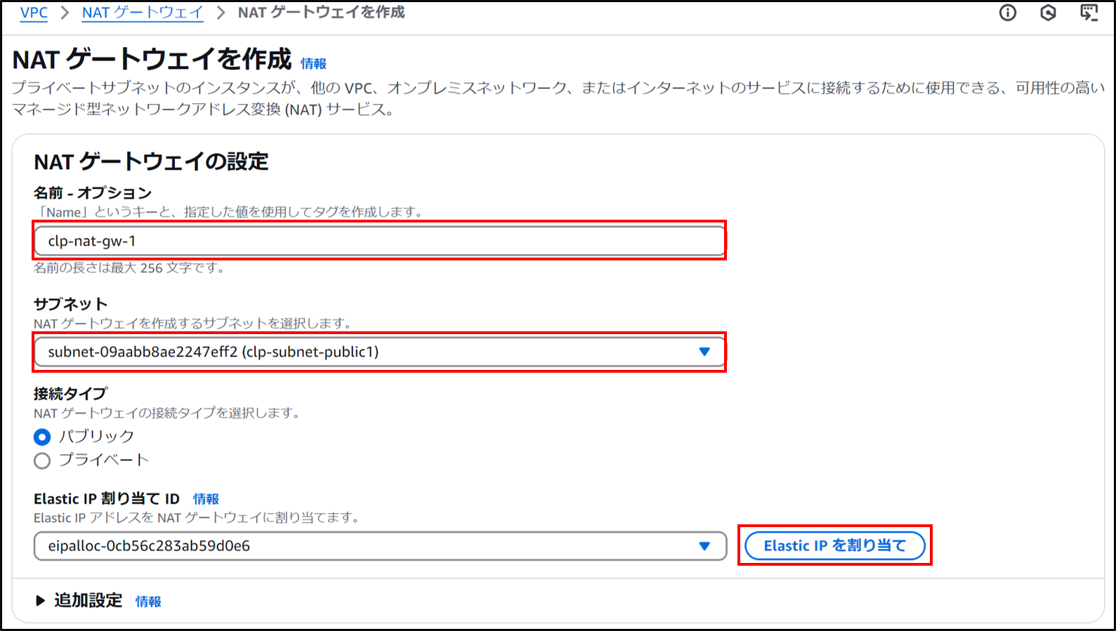 Public Subnet 1に配置するNATゲートウェイ(NAT gateway 1)を作成します。AWSマネジメントコンソールから、VPCサービスを開きます。左のメニューから[仮想プライベートクラウド]→[NAT ゲートウェイ]を選択し、画面右上の[NAT ゲートウェイを作成]をクリックします。[名前]に「clp-nat-gw-1」と入力し、[サブネット]は「clp-subnet-public1のID」を選択します。[Elastic IP を割り当て]を押して、Elastic IPを割り当てます。設定が完了したら[NAT ゲートウェイの作成]をクリックします。