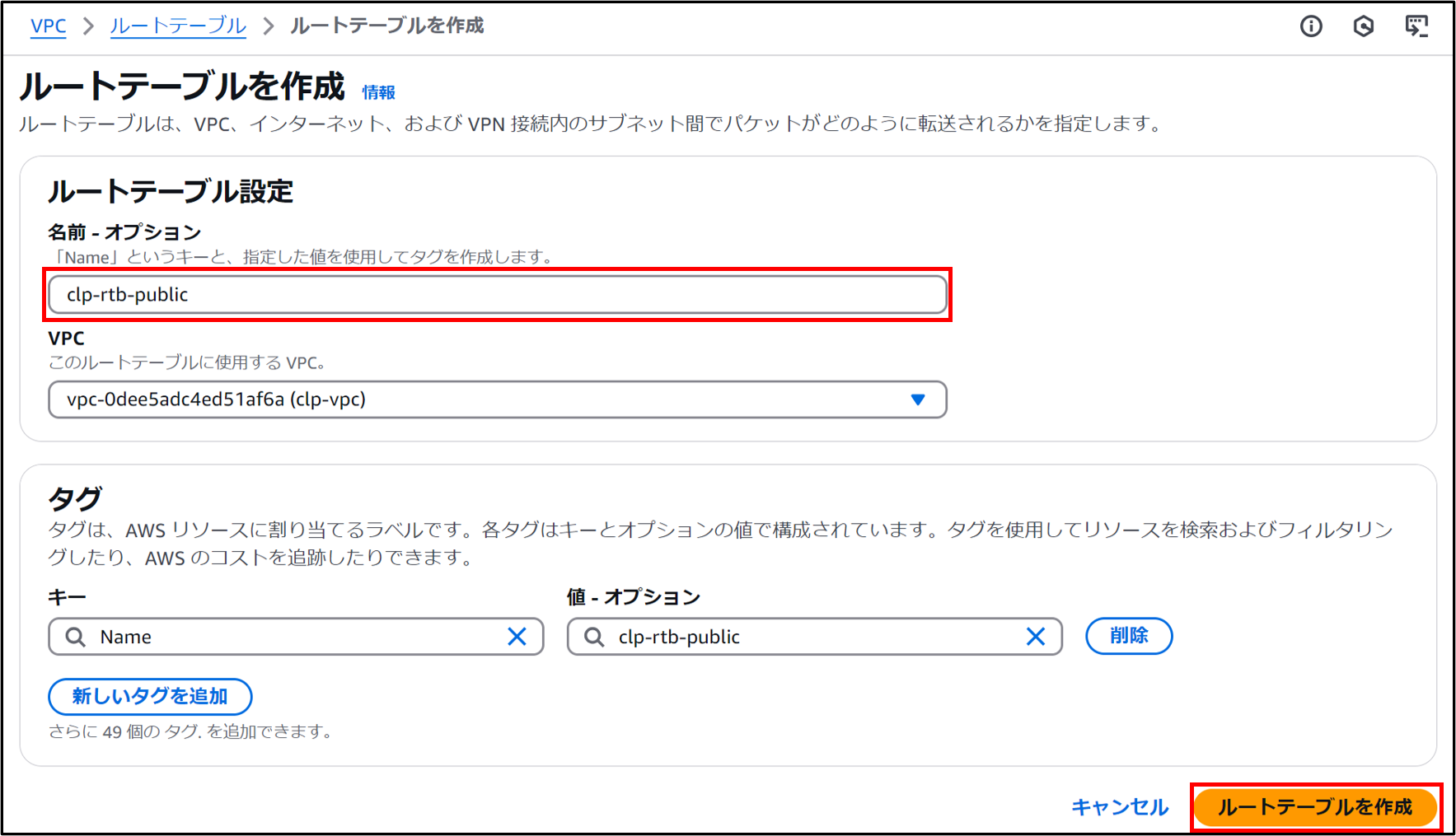 まずはパブリックサブネットに配置するルートテーブル(Public Route Table)を作成します。AWSマネジメントコンソールから、VPCサービスを開きます。左のメニューから[仮想プライベートクラウド]→[ルートテーブル]を選択し、画面右上の[ルートテーブルを作成]をクリックします。[名前]に「clp-rtb-public」と入力し、[VPC]は「clp-vpc」を選択します。[ルートテーブルを作成]をクリックします。