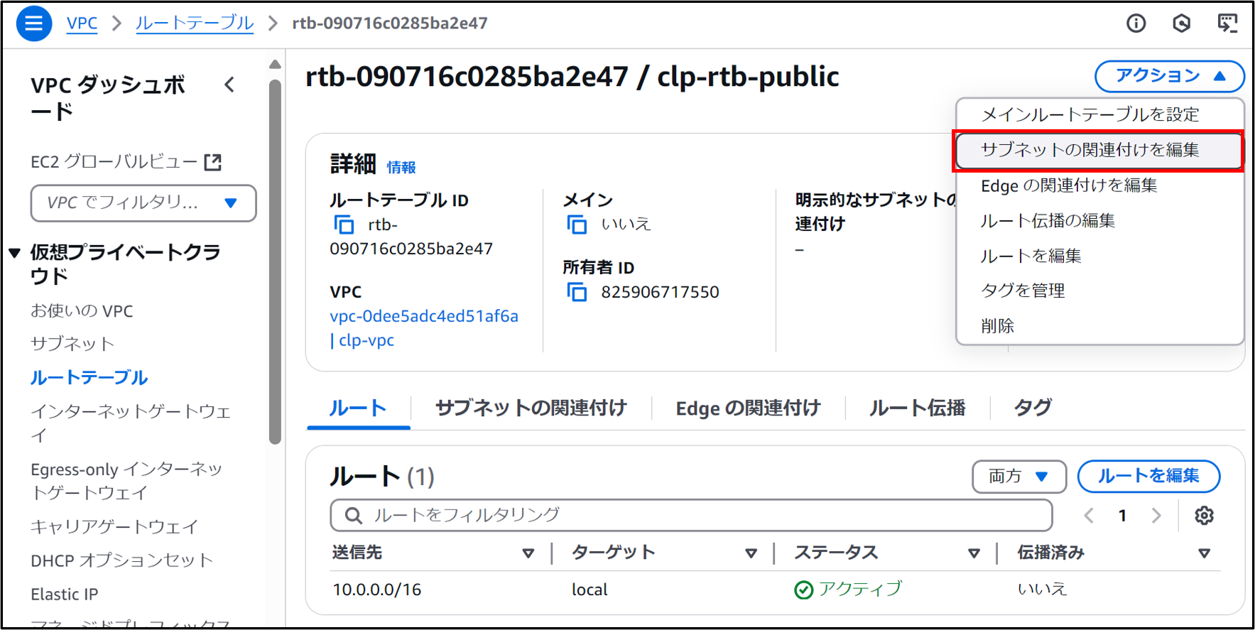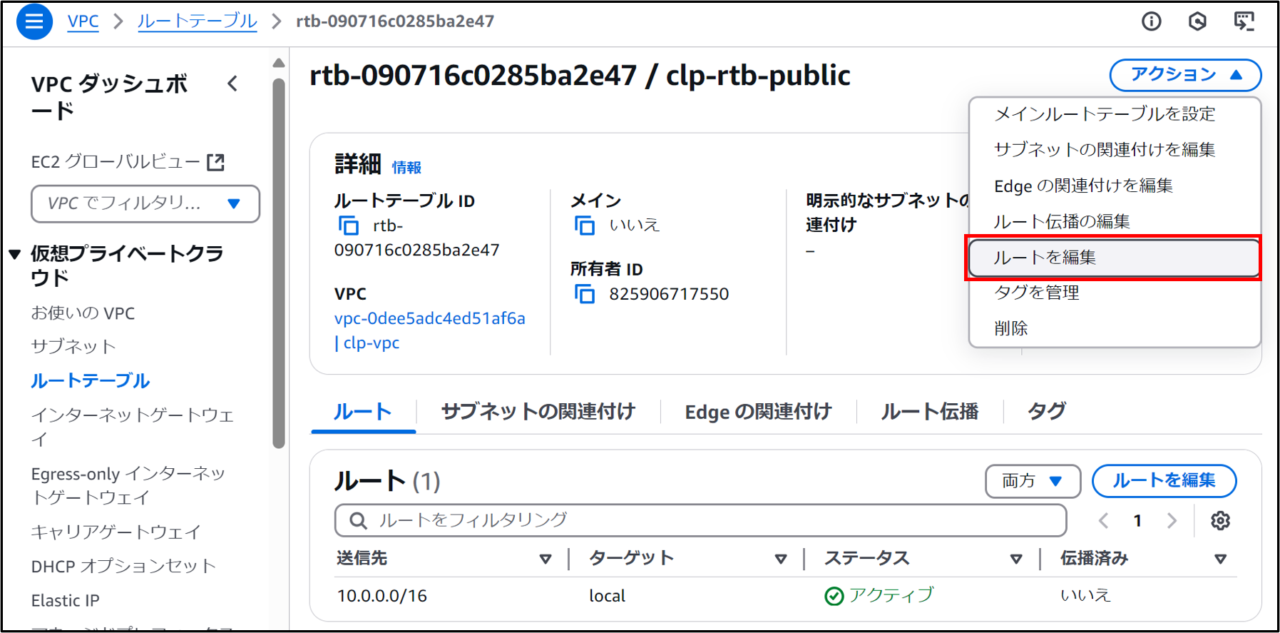 ルーティング設定を行います。ルートテーブルの一覧からclp-rtb-publicのルートテーブルIDをクリックします。[アクション]→[ルートを編集]を選択します。