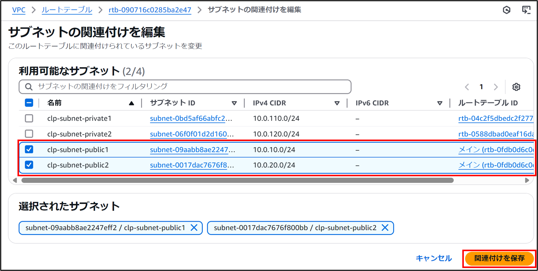 clp-rtb-publicはパブリックサブネット(clp-subnet-public1/clp-subnet-public2)を選択します。設定が完了したら[関連付けを保存]をクリックします。